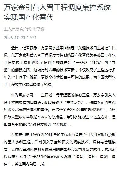 2025年信息技術應用創新解決方案應用推廣大會在浙江杭州舉辦。會上,2024信息技術應用創新解決方案入圍名單揭曉。萬家寨水控集團子公司萬家寨引黃水務集團申報的“山西萬家寨引黃調度集控系統”成功入圍,成為全國水利行業唯一重點推薦應用案例。“這個榮譽含金量極高,意味著我們研發的集控系統具有突出行業應用示范性,能替代進口,為水利水電領域關鍵基礎設施提供成熟、全面的國產集中監控方案,有效降低對國外技術的依賴,筑牢智慧水利安全底線。”萬家寨引黃水務集團擴機項目部負責人徐東文說。