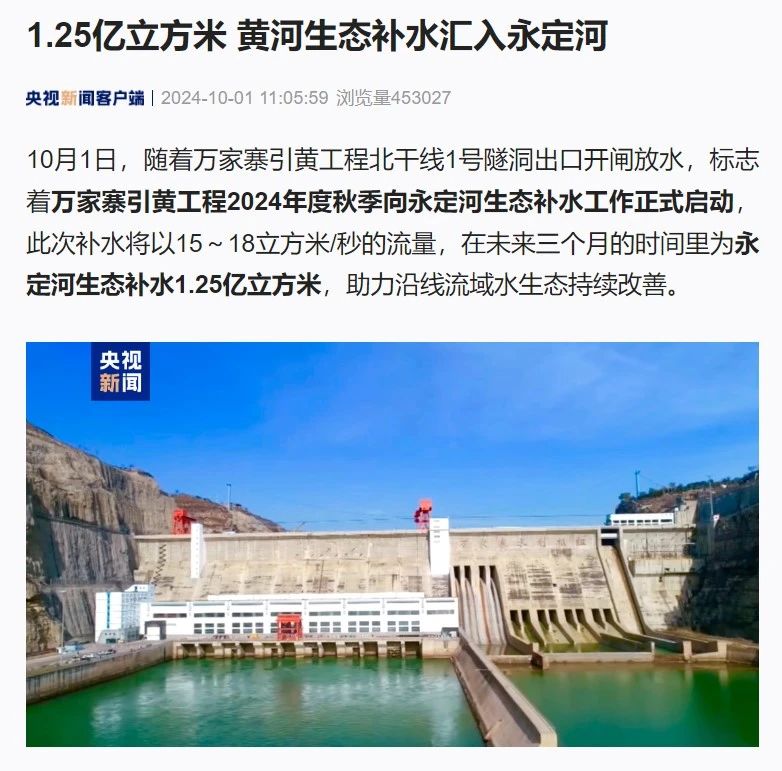 10月1日,隨著萬家寨引黃工程北干線1號隧洞出口開閘放水,標志著萬家寨引黃工程2024年度秋季向永定河生態補水工作正式啟動,此次補水將以15~18立方米/秒的流量,在未來三個月的時間里為永定河生態補水1.25億立方米,助力沿線流域水生態持續改善。