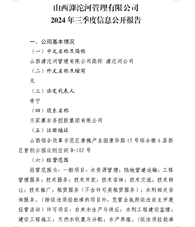 山西水投汾景水務有限公司2024年第三季度信息公開...